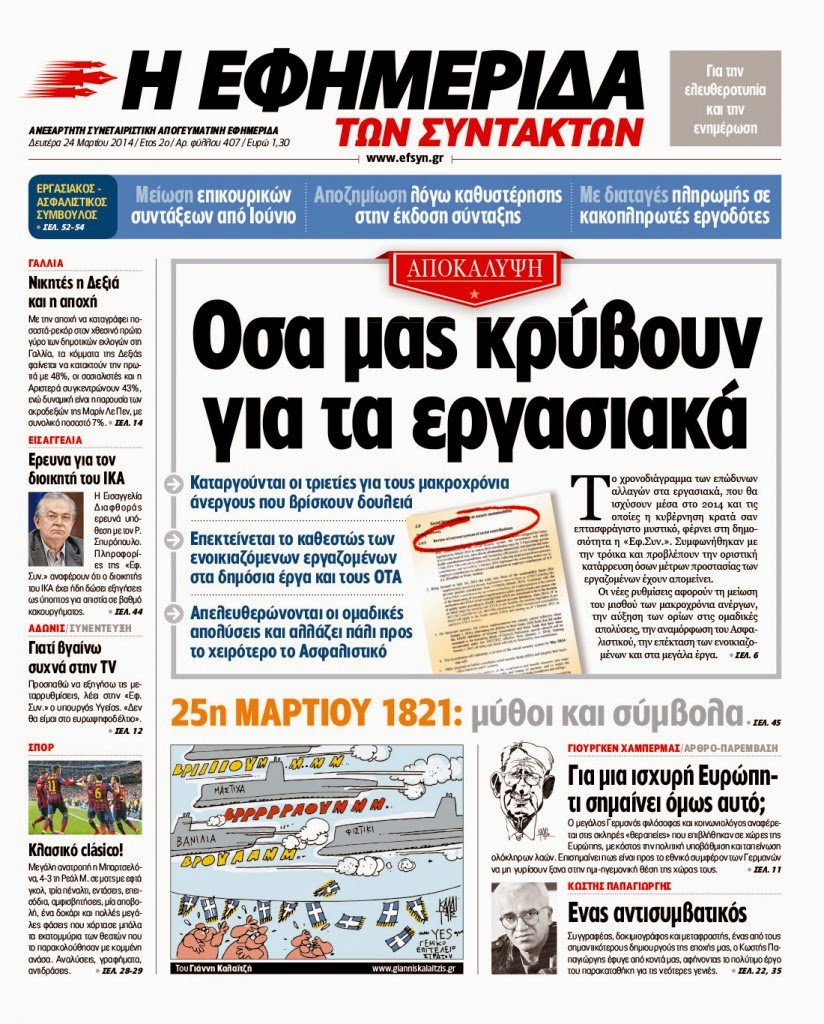 Η «Εφ.Συν.» έχει στη διάθεσή της την έγγραφη συμφωνία που επιμελώς κρατούν στο συρτάρι ο πρωθυπουργός Αντ. Σαμαράς, ο αντιπρόεδρος Ευάγγ. Βενιζέλος και οι αρμόδιοι υπουργοί Γ. Βρούτσης και Γ. Στουρνάρας. Είναι προφανές ότι η κυβέρνηση, που θα υλοποιεί σιγά σιγά τα συμφωνηθέντα, ήθελε να αποκαλύψει αυτή τη συμφωνία μετά τις ευρωεκλογές και τις εκλογές της αυτοδιοίκησης, ώστε να περιορίσει την εκλογική συντριβή των ΠΑΣΟΚ και Ν.Δ.