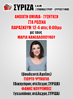 $ 0 0 Η Τ.Ο. ΣΥΡΙΖΑ-ΕΚΜ Ξυλοκάστρου-Ευρωστίνης διοργανώνει ανοιχτή ομιλία-συζήτηση την Παρασκευή 12/4 στις 8μμ στα Ροζενά με τους Μαρία Κανελλοπούλου (βουλευτής Αχαΐας)Γιώργος Ψυχογιός (δικηγόρος-στέλεχος ΣΥΡΙΖΑ)Φάνης Κουρεμπές (γεωπόνος-στέλεχος ΣΥΡΙΖΑ)